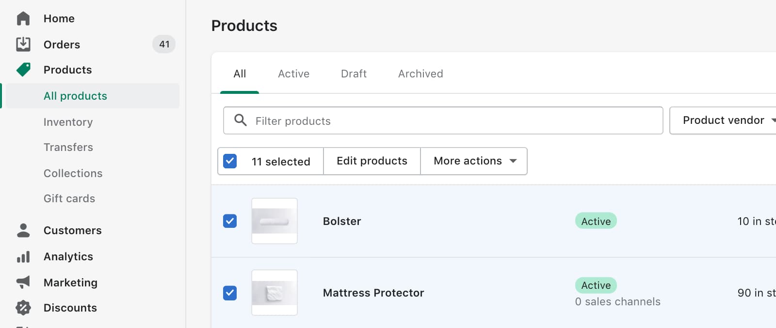 דרך נוספת לעשות זאת, שקל יותר לזכור היא לעבור אל all product < product כך שכתובת האתר שלך מציגה כעת /admin/products?selectedView=all. לאחר מכן הסר את חלק הסיום לאחר סימן השאלה, ובמקום זאת פשוט הוסף /count.json.