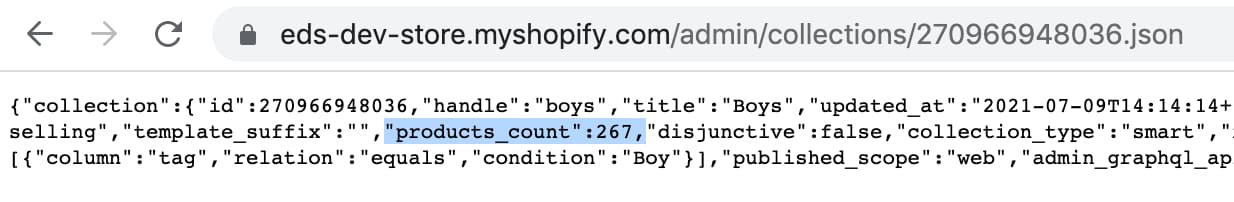 זה מראה לך את מידע ה-collection כאובייקט javascript. אבל אל דאגה, אתה לא צריך להבין הכל, פשוט חפש שורה שאומרת products_count. המספר שאחריו הוא מספר המוצרים בקולקציה זו.