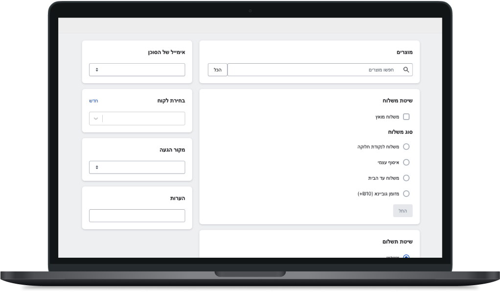 פיתוח אפליקציית Shopify פרטית לטובת מוקד המכירות הטלפוני - דרכה המוקד מנהל את מערך ההזמנות, רואה את סטטוס הדיוור של הלקוחות וכך מאפשר להם לייצר הזמנה עבור הלקוחות הטלפוניים בכמה קליקים בודדים - תוך שמירה על גמישות במתודות המשלוח והתשלום.